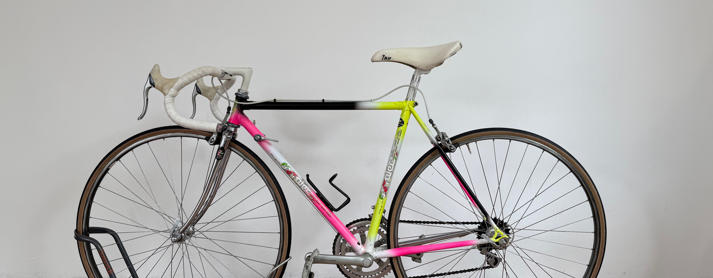 Dieses Corratec Rennrad ist ein schönes Beispiel für die bunten und auffälligen Designs der späten 1980er und frühen 1990er Jahre. Mit seiner markanten Neon-Lackierung in Pink, Gelb und Schwarz verkörpert es den Zeitgeist einer Ära, in der mutige Farben den Radsport prägten. Corratec, eine deutsche Marke mit Wurzeln in Raubling, Bayern, steht seit jeher für innovative Entwicklungen und qualitativ hochwertige Rahmen. Dieses Modell wurde aus leichten Stahlrohren gefertigt und mit zuverlässigen Komponenten aufgebaut, wodurch es sowohl optisch als auch technisch überzeugt. Ein klassisches Rad, das die Brücke zwischen Rennsport und Stilbewusstsein schlägt und bis heute viele Sammler begeistert.
